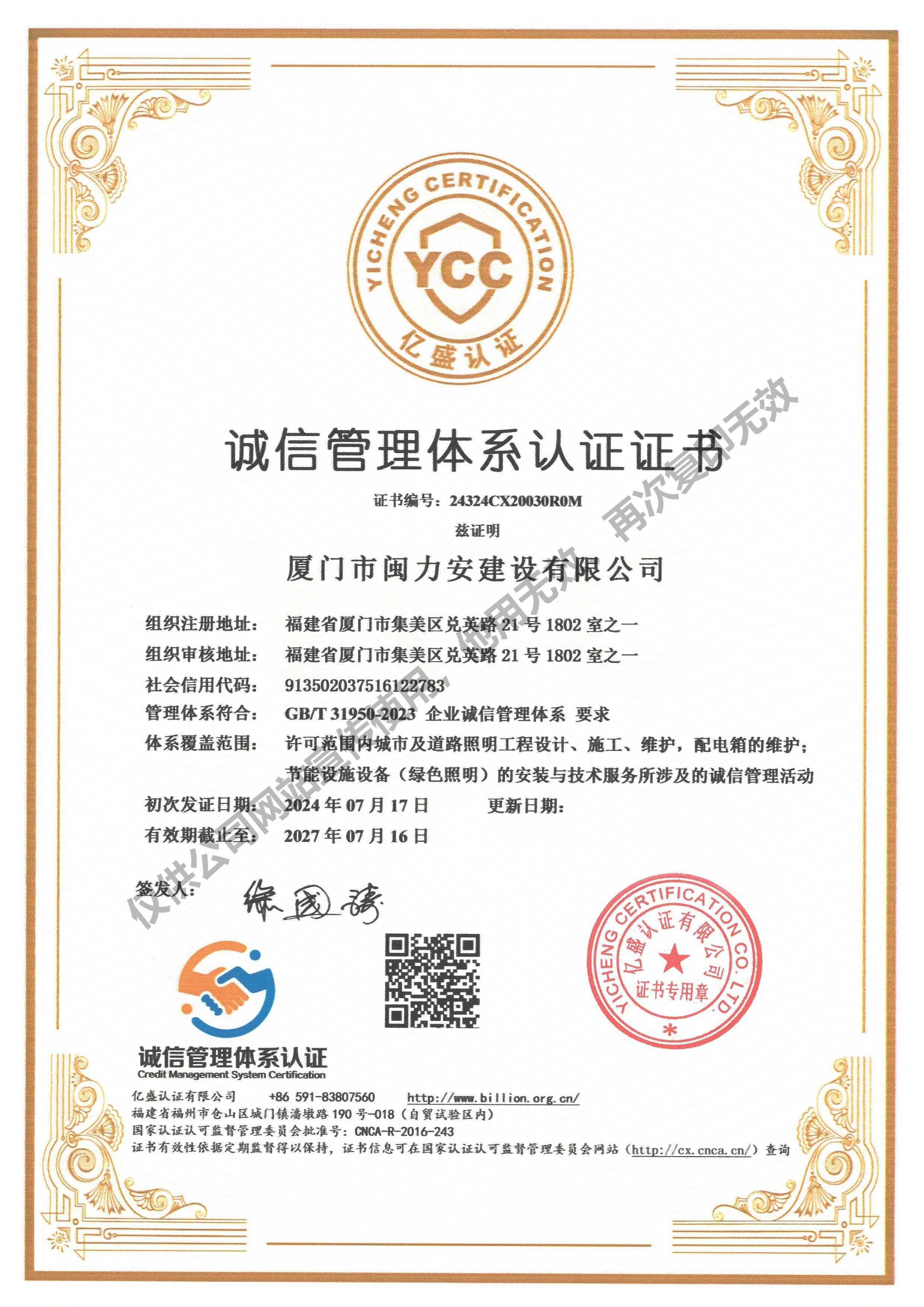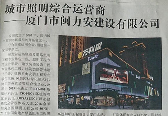 廈門市閩力安建設(shè)有限公司成立于2003年,公司取得市政公用工程施工總承包貳級、建筑裝修裝飾工程專業(yè)承包壹級、城市及道路照明工程專業(yè)承包壹級、電子與智能化工程專業(yè)承包貳級、消防設(shè)施工程專業(yè)承包貳級、電力工程施工總承包叁級、建筑機電安裝工程專業(yè)承包叁級、輸變電工程專業(yè)承包叁級、環(huán)保工程專業(yè)承包叁級、照明工程設(shè)計專項甲級、建筑裝飾工程設(shè)計乙級、施工勞務(wù)等資質(zhì)的綜合型企業(yè),公司于2013年通過了ISO9001質(zhì)量體系認(rèn)證,ISO14001環(huán)境管理體系認(rèn)證,OHSAS18001職業(yè)健康安全管理體系認(rèn)證。